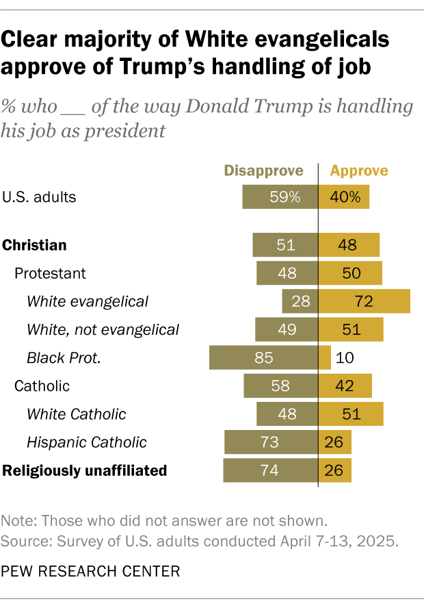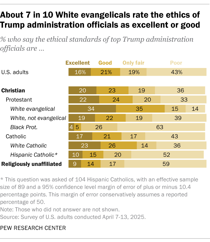 전체 국민의 다수인 62%는 트럼프 행정부의 윤리의식이 보통 혹은 나쁘다고 평했고 흑인 개신교도(88%), 종교가 없는 사람(76%), 히스패닉 가톨릭 신자(72%) 대다수는 윤리성을 더더욱 부정적으로 보고 있었다. 백인 복음주의자 4분의 3은 ‘다양성, 형평성, 포용성(DEI) 정책’을 없애려는 트럼프 정부 조치에 찬성했고 연방정부 축소와 예산 삭감에 찬성했다. 백인 복음주의자의 3분의 2는 관세 인상을 지지했다. 이 또한 다른 인종, 다른 종교 집단과는 큰 차이를 보였다.