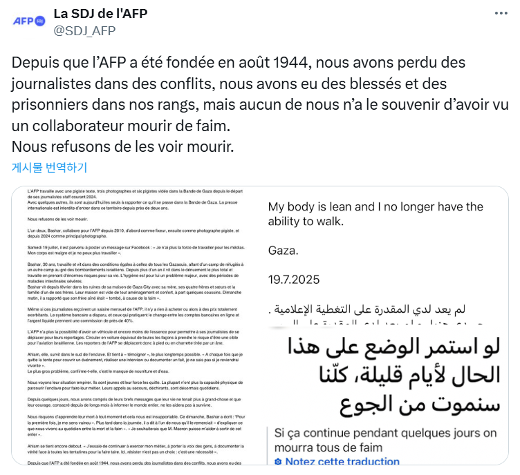 위협과 통제 속에서도 가자 상황을 알리던 기자들조차 굶어죽고 있다. “1944년 설립된 이래로 우리는 분쟁에서 기자를 잃었으며 부상자와 포로가 된 기자도 있었지만, 동료가 굶어 죽는 것을 본 적은 없다.” 프랑스 통신사 AFP 기자협회가 21일 발표한 글이다. 가자지구에 사는 이 통신사 사진기자 바샤르 탈레브는 소셜미디어에 “내 몸은 말라가고 더 이상 일할 수 없다”라고 썼다. 회사 측은 이스라엘 정부에 통신원과 기자들이 출국할 수 있도록 해달라고 촉구했다.
