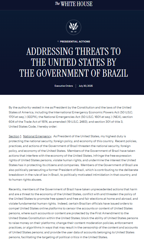 그러더니 이제는 브라질 법관을 ‘인권 침해 연루자’로 지목했다. 트럼프는 7월 30일 무려 2221단어짜리 성명에서 “브라질의 최근 정책은 미국의 국가안보와 외교정책과 경제에 위협을 가하고 있다” “지 모라에스는 사법 권한을 남용해 미국 소셜미디어 기업을 검열했다”고 주장했다. 관세 폭탄을 ‘전직 대통령 박해’와 엮으면서 트럼프는 “브라질 정부의 위협에 대한 비상사태”를 선포했다.