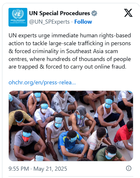 5월 21일 유엔 인권최고대표사무소(OHCHR) 전문가들이 이 스캠센터들에 대한 조사 내용을 발표했다. 캄보디아, 미얀마, 라오스, 필리핀, 말레이시아 등에 사기조직들이 근거지를 두고서 여러 나라 피해자를 속여 강제노동과 범죄 행위로 내몰고 있다고 했다. 피해자들이 여권을 빼앗긴 채 감금되며 고문과 신체적 학대, 성폭력을 당하는 경우도 많았다. 심지어 다른 범죄 조직에 팔려가거나 가족에게 몸값을 요구받기도 했으며, 탈출을 시도하면 가혹한 처벌을 받거나 사망에 이르는 경우도 있었다. 이런 범죄조직들이 지역 정치인이나 법 집행기관 등과 결탁돼 있다는 점도 지적됐다. 유엔은 스캠센터들의 상황은 인권 위기에 해당된다며 국제사회와 동남아 국가들이 긴급 대응에 나서라고 촉구했다.
