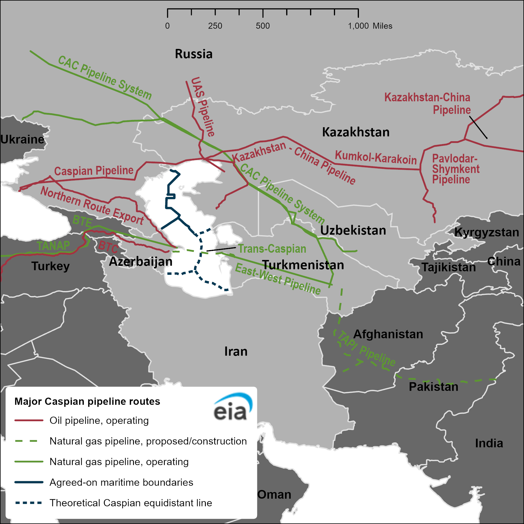 정작 아제르바이잔의 원유 생산은 2010년 정점을 찍고 하락세다. 그래서 지금은 천연가스 생산으로 이동하고 있다. 2020년 말부터 남부가스회랑(SGC) 파이프라인을 통해서 유럽에 에너지를 직접 공급할 수 있게 됐다. 카자흐스탄은 1979년 발견된 텡기즈 유전을 독립 이후 대규모로 개발했고 2001년에는 CPC 송유관을 개통했다. 흑해를 통해 원유를 수출할 수 있게 되면서 주요 에너지 수출국으로 떠올랐다. 2010년대 이후로는 카자흐스탄이 카스피해 석유 생산량의 55%, 아제르바이잔은 약 20%를 차지한다. 투르크메니스탄은 2009년 중앙아시아와 중국을 잇는 가스관을 이으면서 후발 주자로 나서고 있다. (러시아와 이란은 자원 대국이지만 카스피해 지역 채굴이 차지하는 비중은 높지 않다)