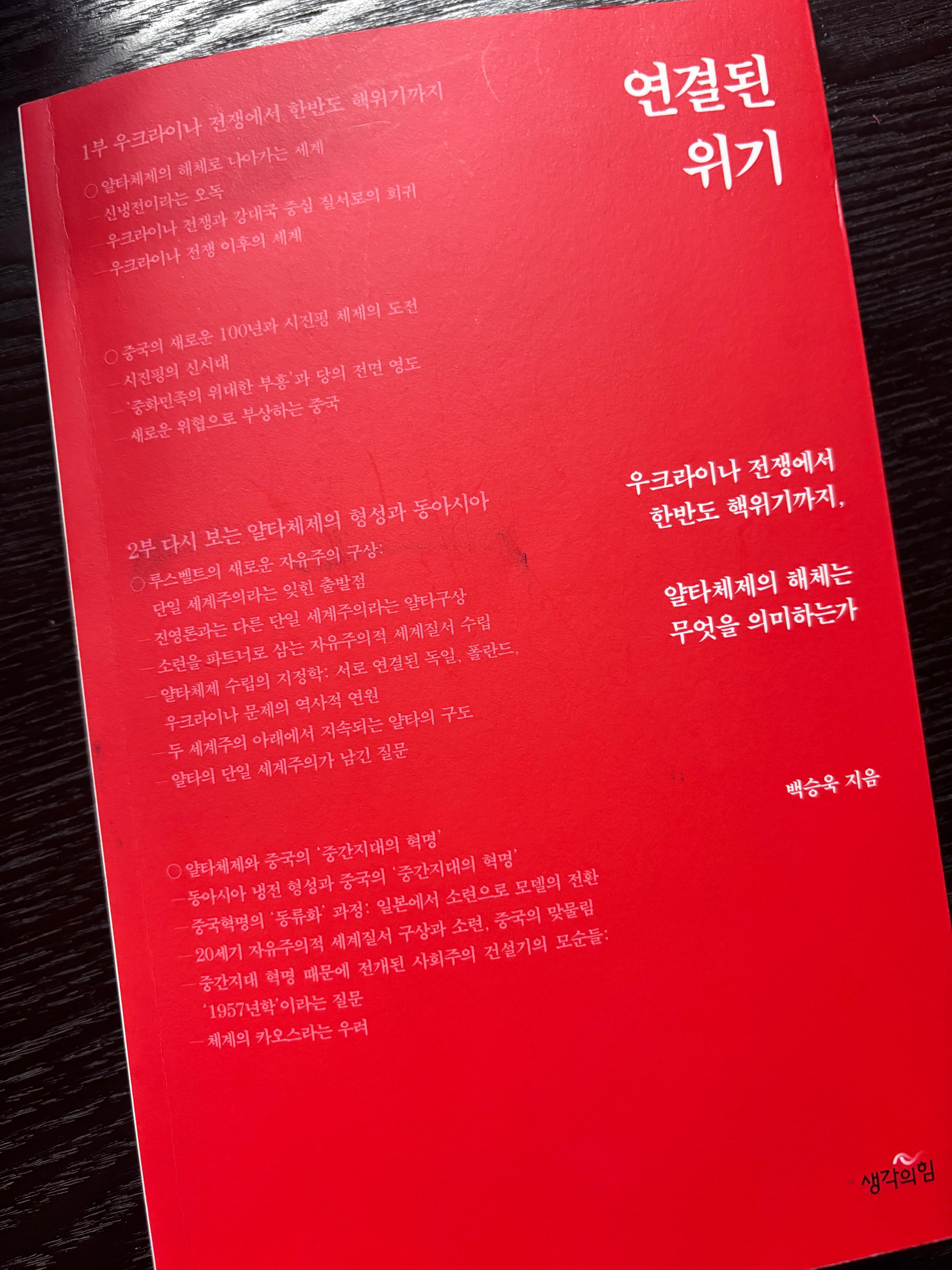 전체적으로 재미있었지만 주제/틀이 선명한 것에 비해 논리적 고리들은 좀 약하단 느낌도. 연결된 위기라는데 연결 고리들이 잘 안 보인다. 러시아가 우크라이나를 침공하면 중국이 대만을 무력 점령할 가능성이 높고 그러면 북한도 한국을 도발할 가능성이 높다는 논리다. 왜? 왜지?
