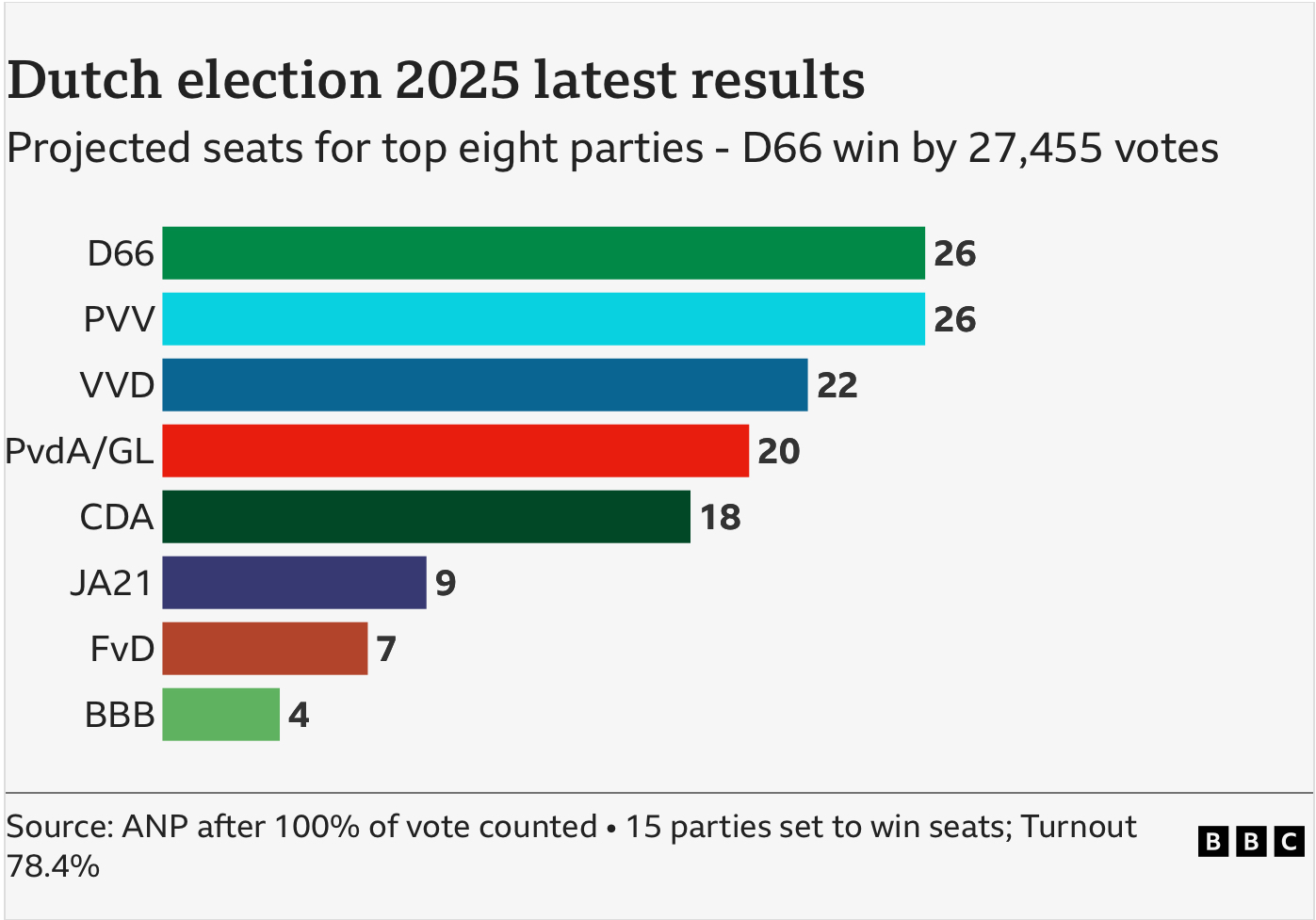 지난달 29일 치러진 네덜란드 총선에서 중도파 민주66(D66)이 승리했다. 1당이 됐다고는 하지만 어쩐지 찝찝하다. 유럽의 대표적인 극우정당인 헤이르트 빌더르스의 자유당(PVV)과 동점이다. 150석 하원에서 각각 26석을 확보하며 초접전을 벌였는데, 민주66이 해외 거주자 우편투표에서 2만8000여표를 더 얻어 근소하게 득표율은 앞섰다.