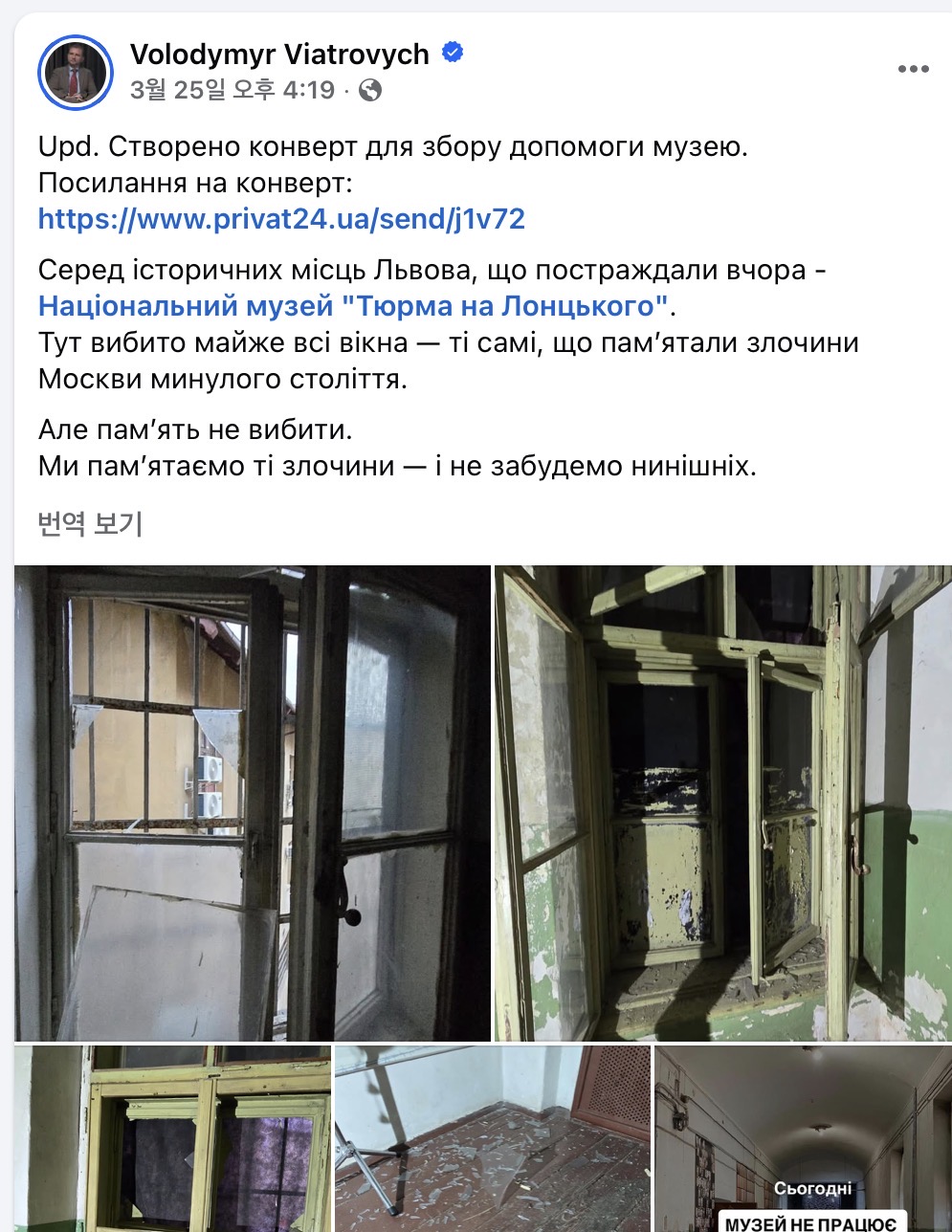 3월 공격으로 19세기에 지어진 르비우의 옛 교도소 건물도 일부 부서졌다. 소련이 반체제 인사들을 가뒀던 곳인데 독립 뒤 ‘점령정권 희생자 추모관’으로 쓰이고 있었다. 우크라이나의 한 정치인은 페이스북에 “지난 세기 모스크바가 저지른 범죄의 증인인 창문들은 산산조각이 됐지만 기억은 조각날 수 없다. 우리는 그 시대의 모든 범죄를 기억하며, 지금 자행되고 있는 범죄 또한 잊지 않을 것”이라고 썼다.
