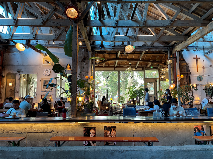 저렇게 넓고 사람들이 오가는데 도심의 흔한 카페들처럼 시끄럽지 않고 생각보다 조용해서 놀랐습니다. 천정이 옛 공장의 나무지붕 그대로여서인지 카페에서 대화조차 나눌 수 없게 만드는 콘크리트 건물들의 웅웅거림이 없어요!